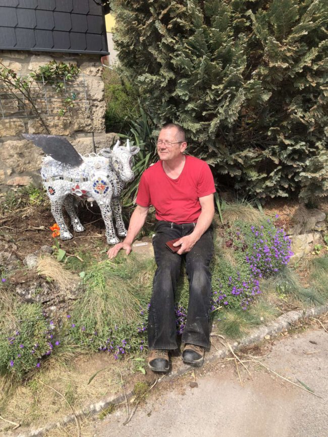 Der Künstler Frank Meyer hat das Mosaikkunstwerk „Die Kuh“ von Anne Schwegmann-Fielding am Kunstwanderweg Kleinbreitenbach aufwändig saniert. Sie steht im Dorf Richtung Ortsausgang. Die Mittel zur Sanierung sind zum großen Teil vom Thüringer Ministerium für Infrastruktur und Landwirtschaft gefördert.