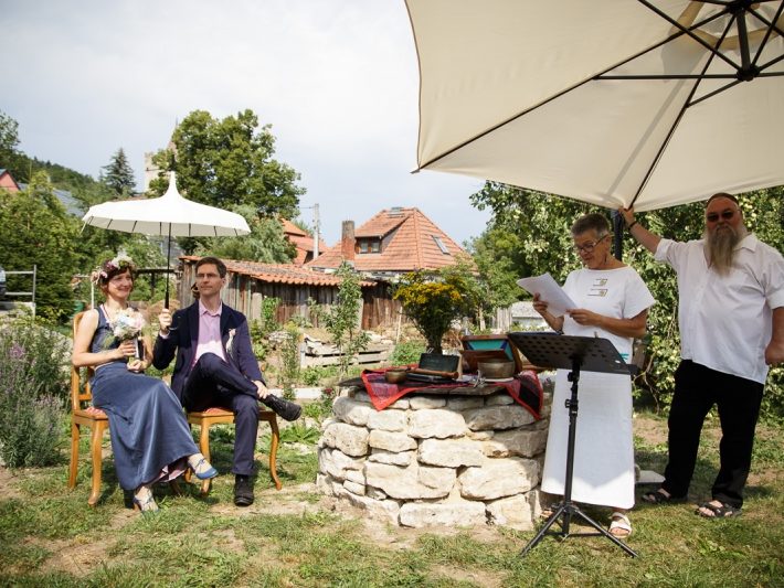 Wir gestalten Ihre Hochzeit ganz nach Ihren Wünschen aus. Im Sommer nutzen wir unser gesamtes Gelände zur Ausgestaltung der Hochzeitsfeier und können bis zu 70 Gäste aufnehmen. In unseren vier Ferienwohnungen können 20 Personen übernachten. Das Reinsberger Dorf ist für weitere Übernachtungen nicht weit entfernt. Eine kirchliche Trauzeremonie kann in der bedeutenden romanischen Wehrkirche, gleich nebenan, stattfinden. Weltliche Trauzeremonien organisieren wir für Sie in unserem blühenden Garten.