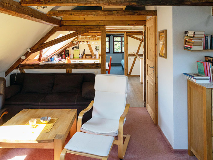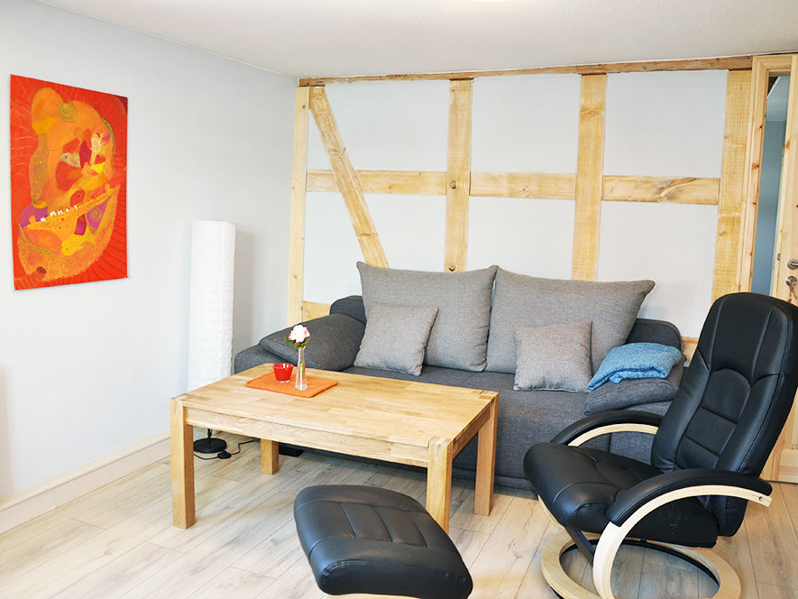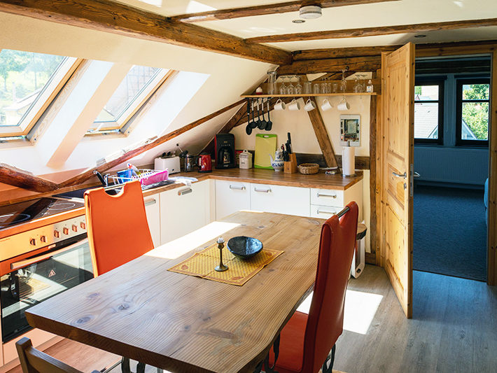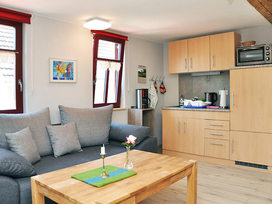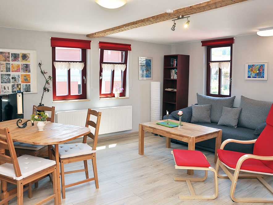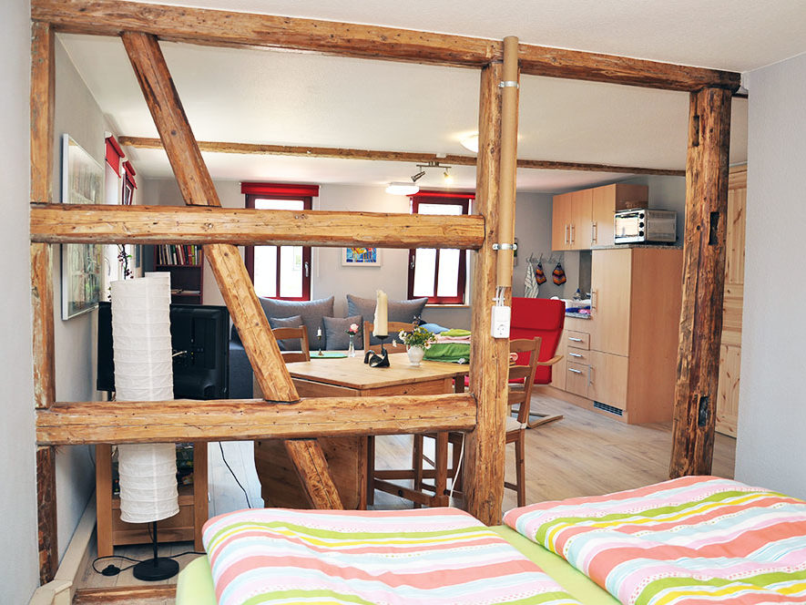 Unsere vier gemütlichen Ferienwohnungen, Belle-Vue, Quelle, Garten und Tenne befinden sich im komplett sanierten Fachwerkhaus bzw. über dem Stallcafé in dörflicher Idylle im 400-Seelen-Ort Kleinbreitenbach in einem geschützten Talkessel ohne Durchgangsverkehr. Sie liegen am umfangreichsten Kunstwanderweg Deutschlands (mit 60 großen Objekten), unweit eines der größten Orchideenvorkommen Europas und bieten Blick auf eine bemerkenswerte romanische Wehrkirche aus dem 12. Jahrhundert. Die faszinierende Landschaft mit den für Thüringen untypischen steilen Muschelkalkfelsen, die klare Luft und die unzähligen Wanderwege sind neben der Ruhe Garant für gute Erholung.